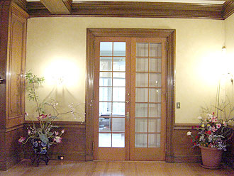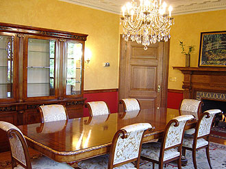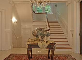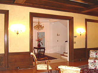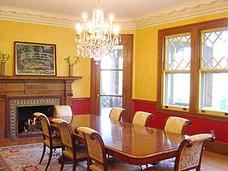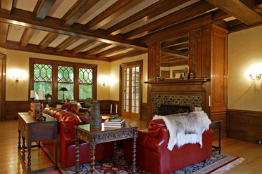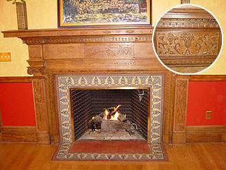 hardwood floors, gas-log fireplace with carved wood mantle,